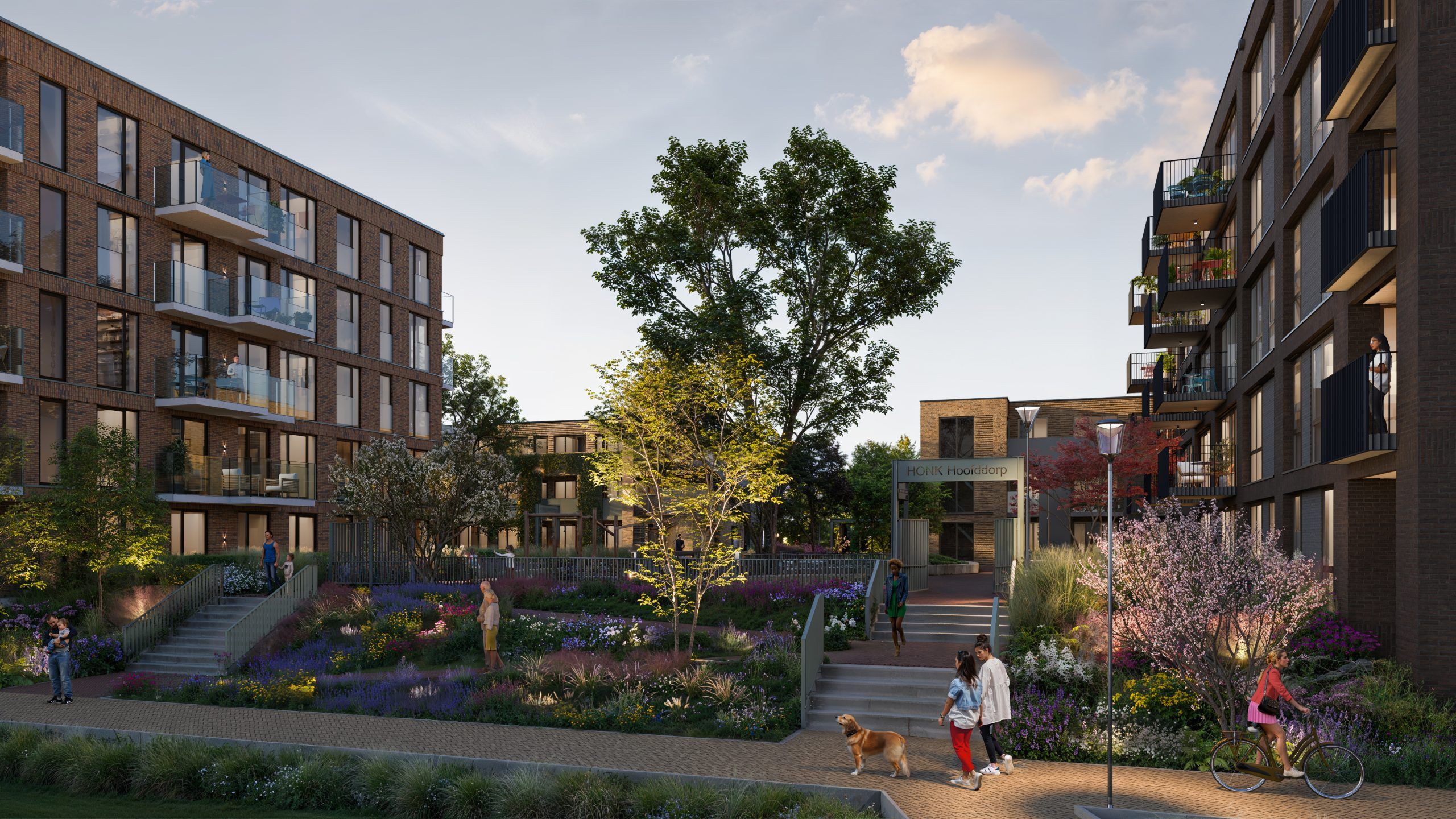 Vanuit het dakpark loop je zo de iets lager gelegen gemeenschappelijk corridor in waar iedereen welkom is. Deze langgerekte groene levensader is dé plek waar alles samenkomt. Het is de verbinder tussen HONK en de omgeving.